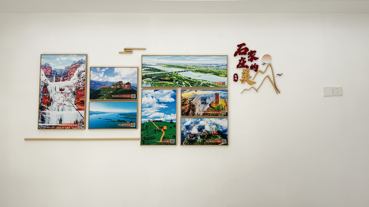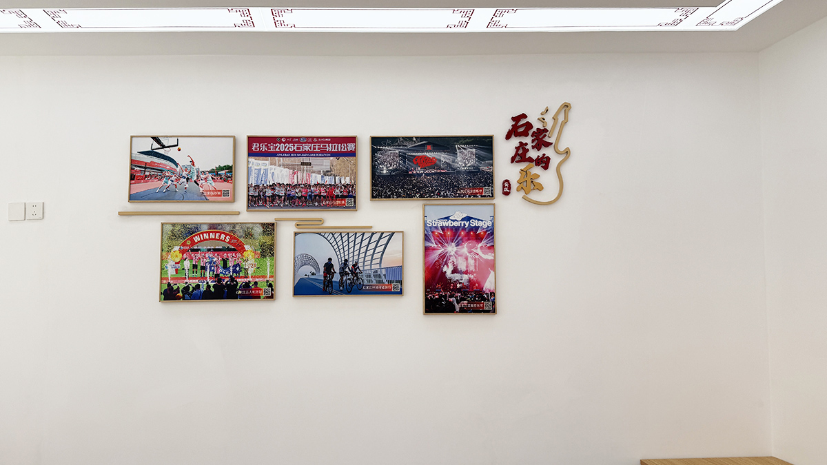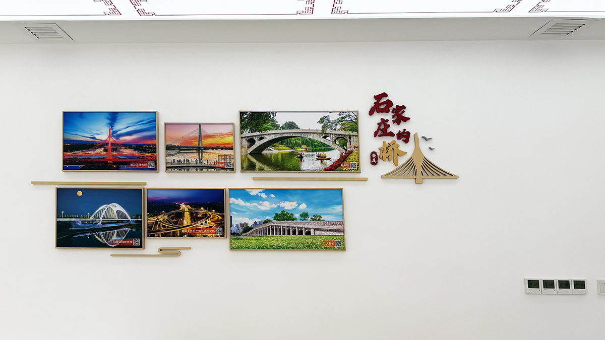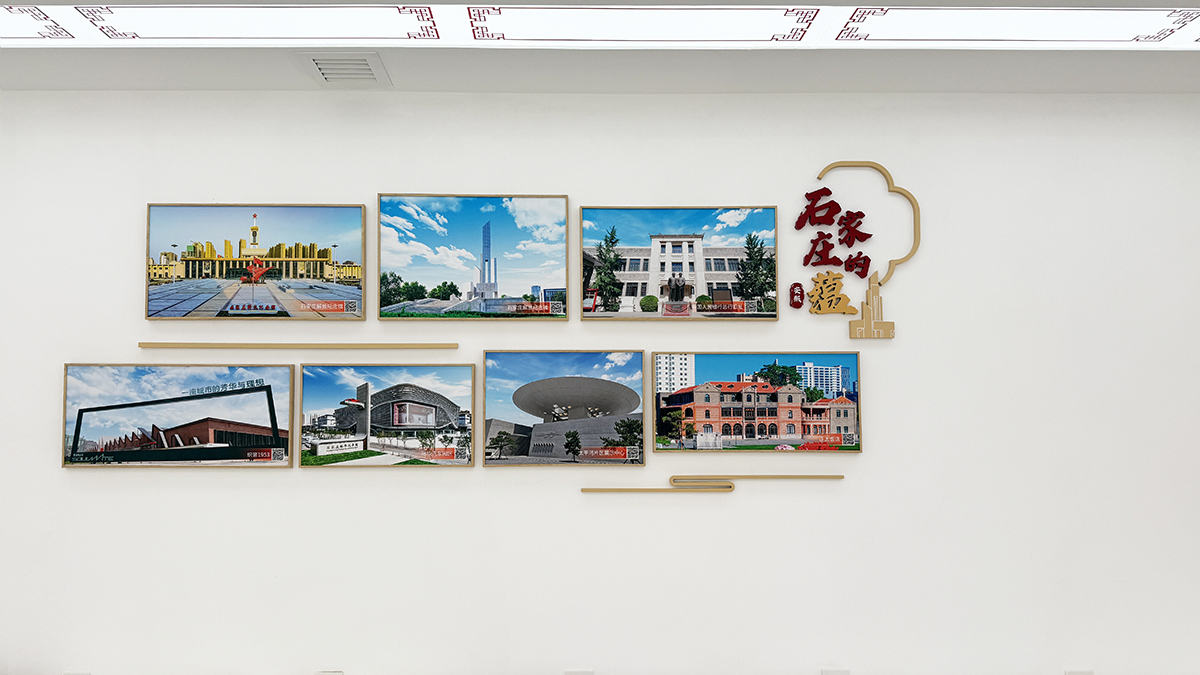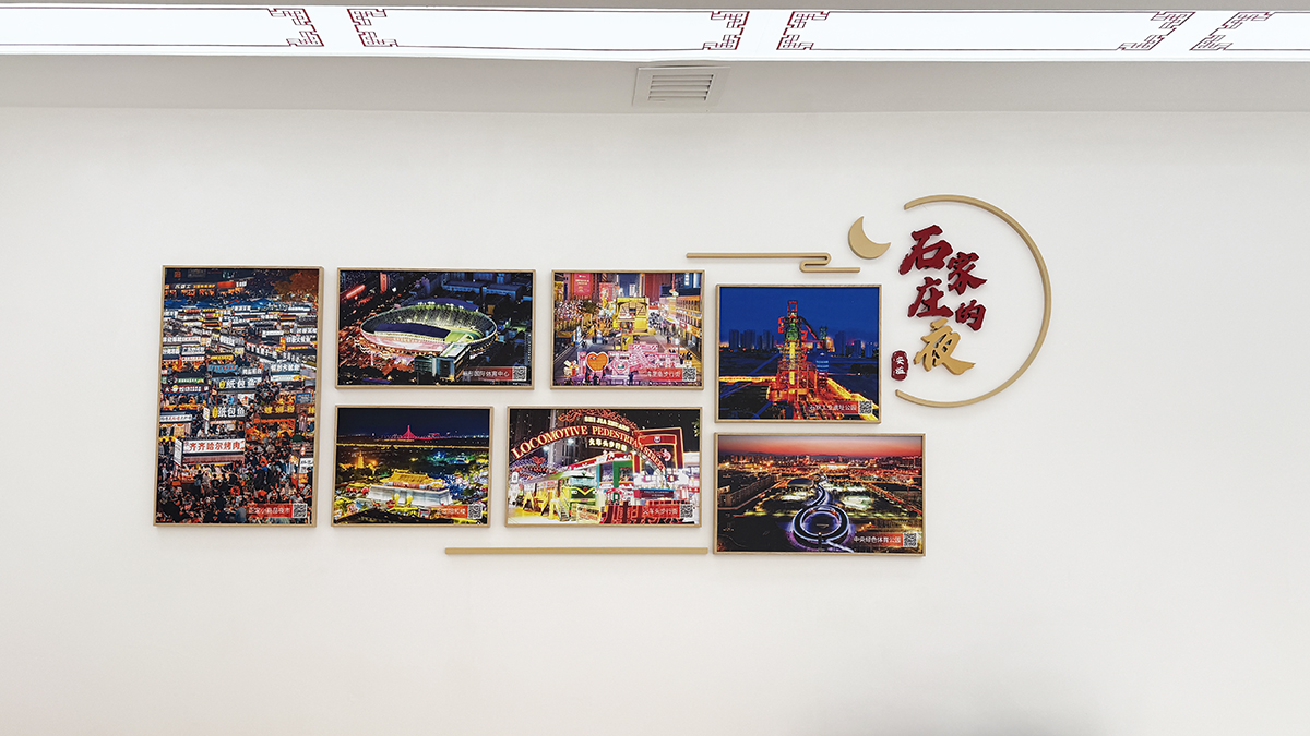 打造“石家庄的——桥、蕴、美、乐、夜”五个主题视觉区域。该视觉区域以33张石家庄标志性照片为主,含5组主题字、印章字和5幅象征性的线形图。其中,印章字“安度、安熙、安澜、安跃、安谧”引申于石家庄公安的“安”字。整体色彩与空间色彩搭配融合和谐。