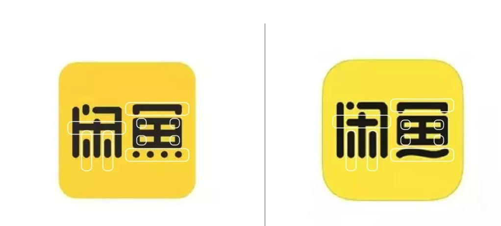 “闲鱼”这两个字体做了局部的处理“闲”将“门”字旁的“丶”笔画由原本的圆角矩形变成了圆形中间的“木”去掉了连笔设计变得更加修长间距也变大了。